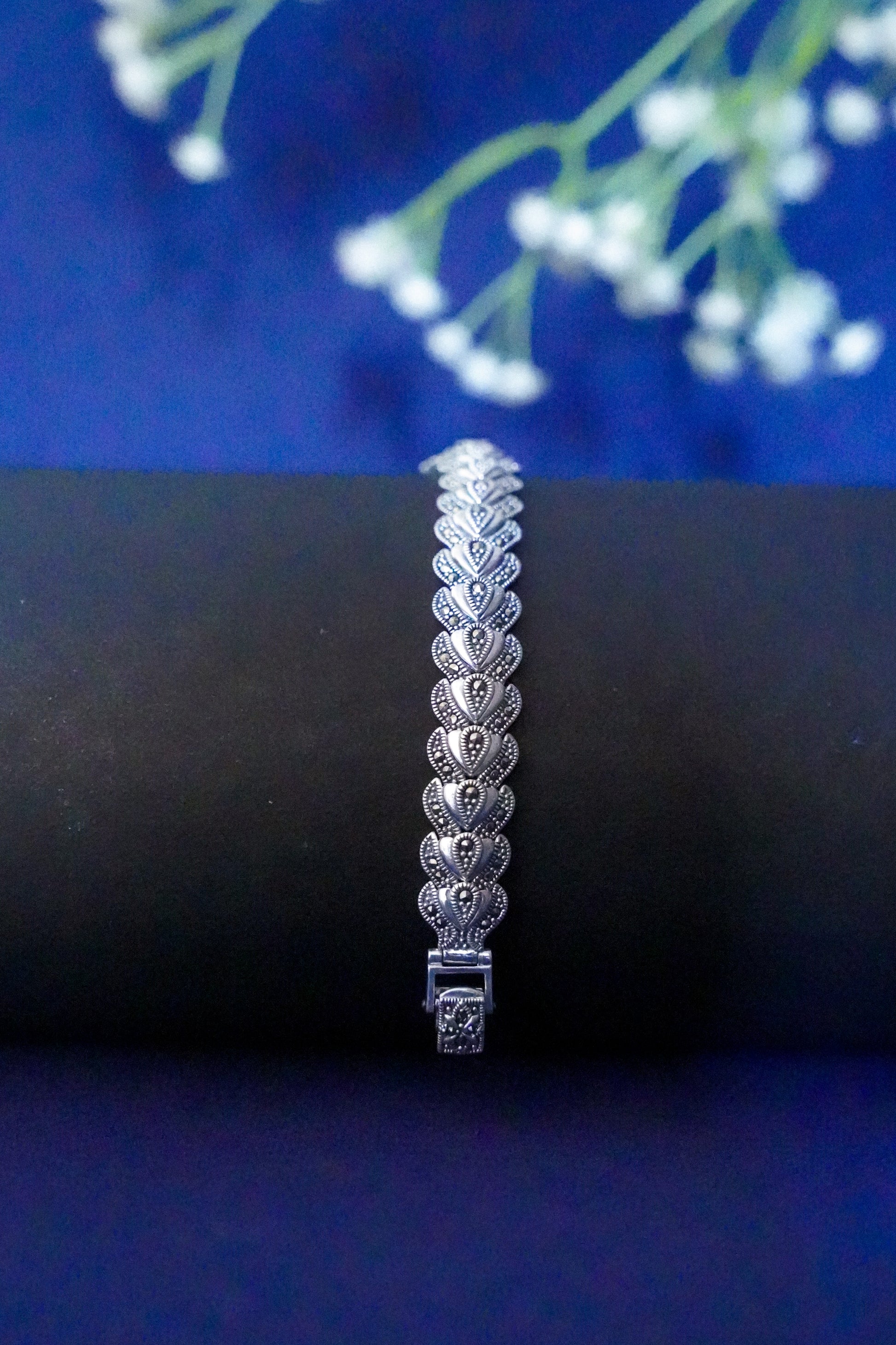 Introducing the Hearts of Grace Marca Silver Bracelet. Crafted with high-quality silver, this elegant piece exudes sophistication and grace. Expertly designed to last, it boasts a timeless design that will elevate any outfit. With intricate hearts adorning the bracelet, it's perfect for expressing your love and appreciation. A must-have accessory for any fashion-forward individual.
