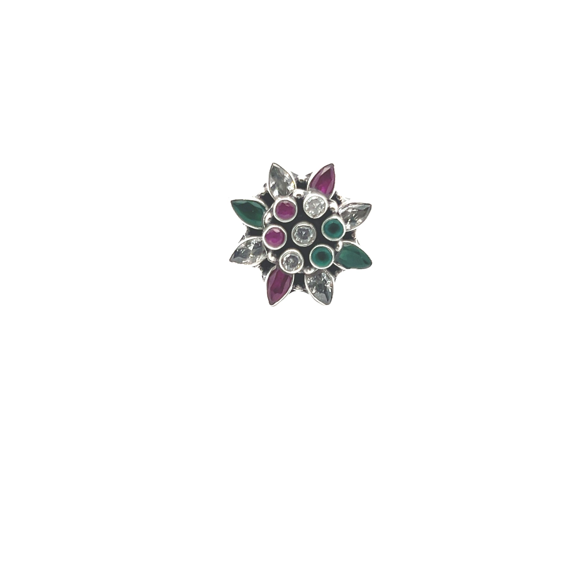 Multicolour Floral Cut Stone Silver Ring is a vibrant and eye-catching piece of jewelry that combines the charm of colorful gemstones with intricate floral designs on a silver base. Crafted from sterling silver, this ring has a polished, durable finish that complements the multicolored stones, making the overall design pop.