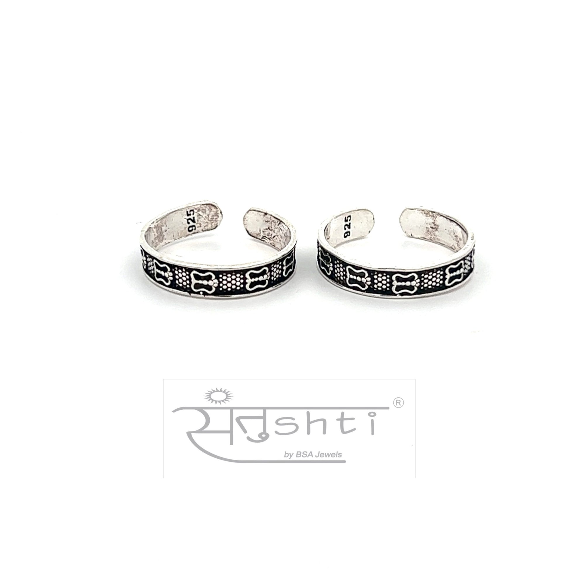 An oxidized silver band toe ring is a unique and stylish piece of jewelry crafted from sterling silver. The oxidized silver band toe ring typically features a smooth and sleek design, with the darkened silver adding depth and character to the piece.