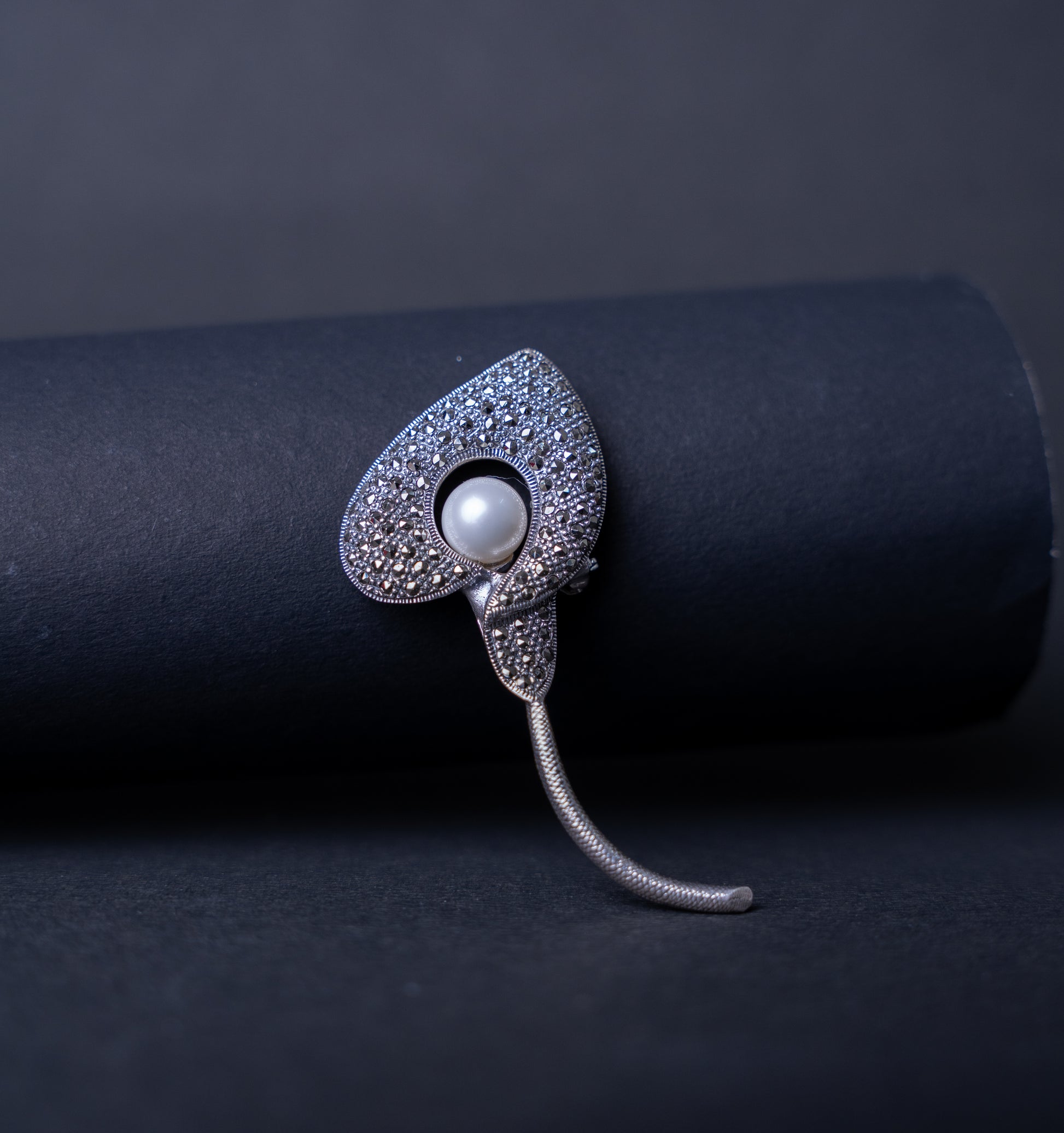 The Calla lily flower brooch features a delicately curved petal design encrusted with marcasite stones, giving it a vintage sparkle and sophisticated charm. At the heart of the brooch sits a luminous pearl, symbolizing purity and refinement, perfectly complementing the shimmering marcasite details. Adding a sophisticated touch to any outfit, this brooch is perfect for special occasions or as a cherished gift for someone who appreciates timeless beauty. Wear it on a lapel, scarf, or dress to elevate your style with classic elegance.